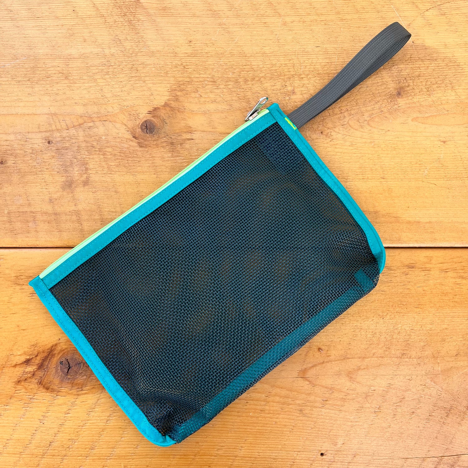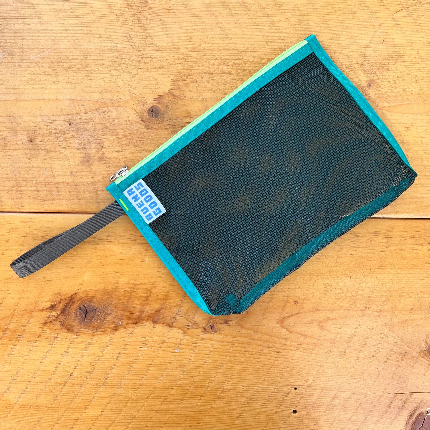 The L size of our pouches - this one is perfect for nesting and organizing - charging cables, sunscreen, toiletries, it's a versatile pouch! Made with industrial mesh, this is a no fuss fabric that is transparent. We use the quality standard brand of YKK zippers on all of our products because durability is a pillar at Buena Goods. How can a good good be good without it?