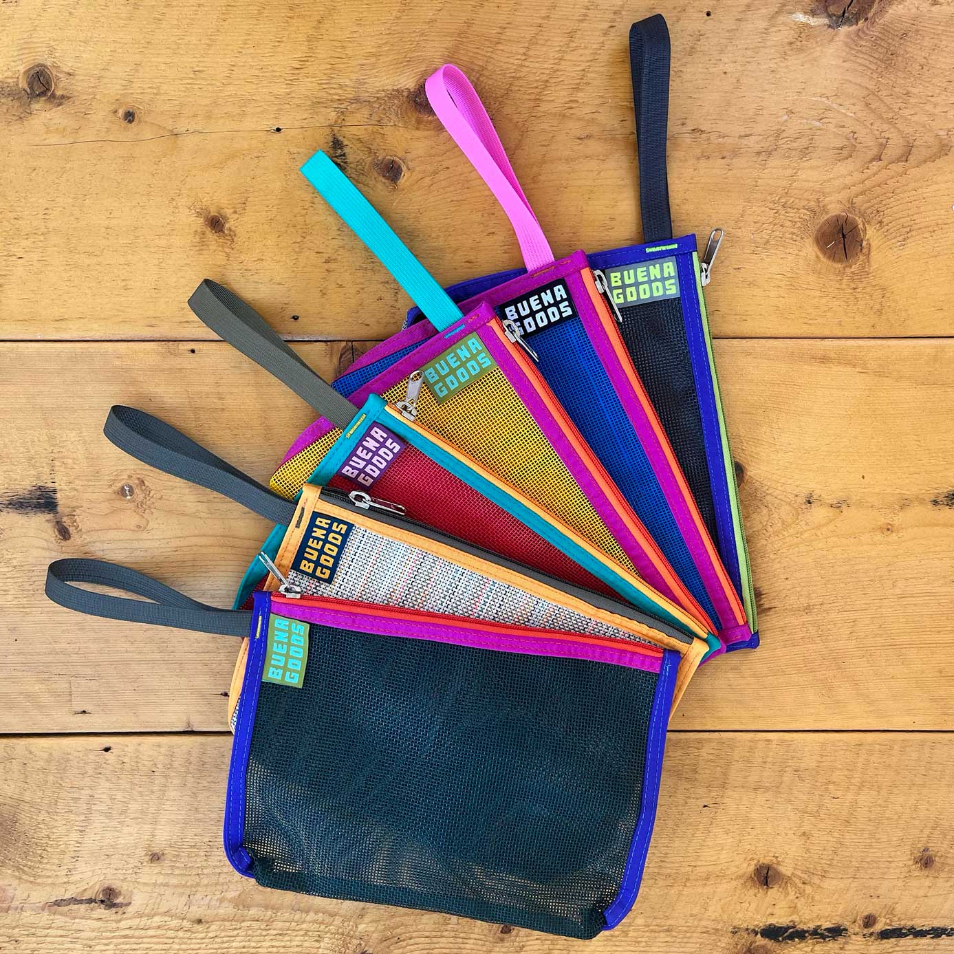 The L size of our pouches - this one is perfect for nesting and organizing - charging cables, sunscreen, toiletries, it's a versatile pouch! Made with industrial mesh, this is a no fuss fabric that is transparent. We use the quality standard brand of YKK zippers on all of our products because durability is a pillar at Buena Goods. How can a good good be good without it?