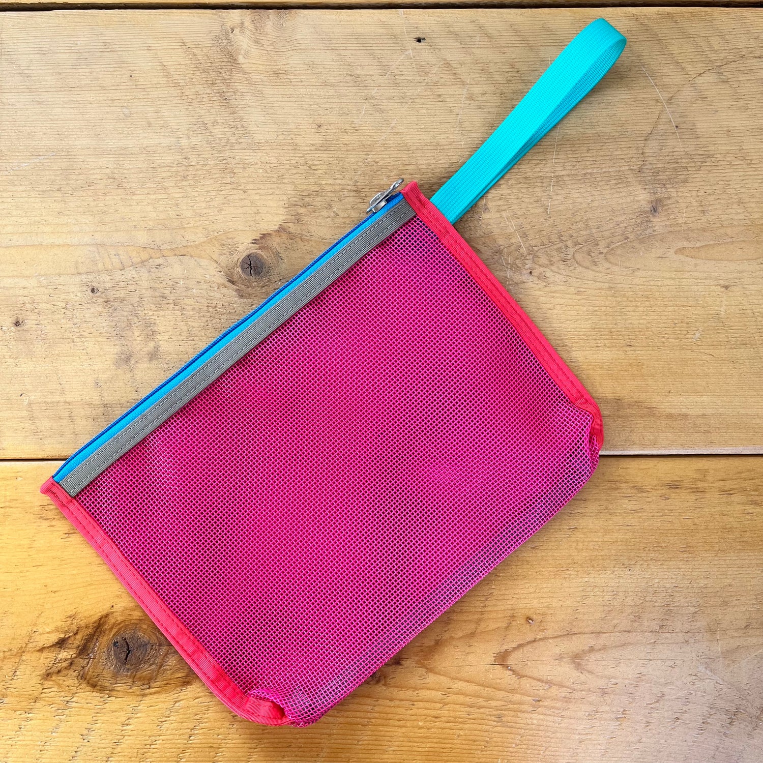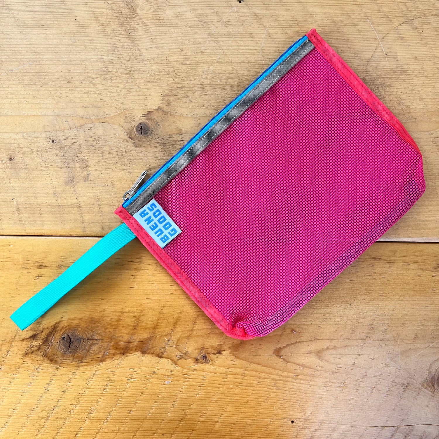The L size of our pouches - this one is perfect for nesting and organizing - charging cables, sunscreen, toiletries, it's a versatile pouch! Made with industrial mesh, this is a no fuss fabric that is transparent. We use the quality standard brand of YKK zippers on all of our products because durability is a pillar at Buena Goods. How can a good good be good without it?
