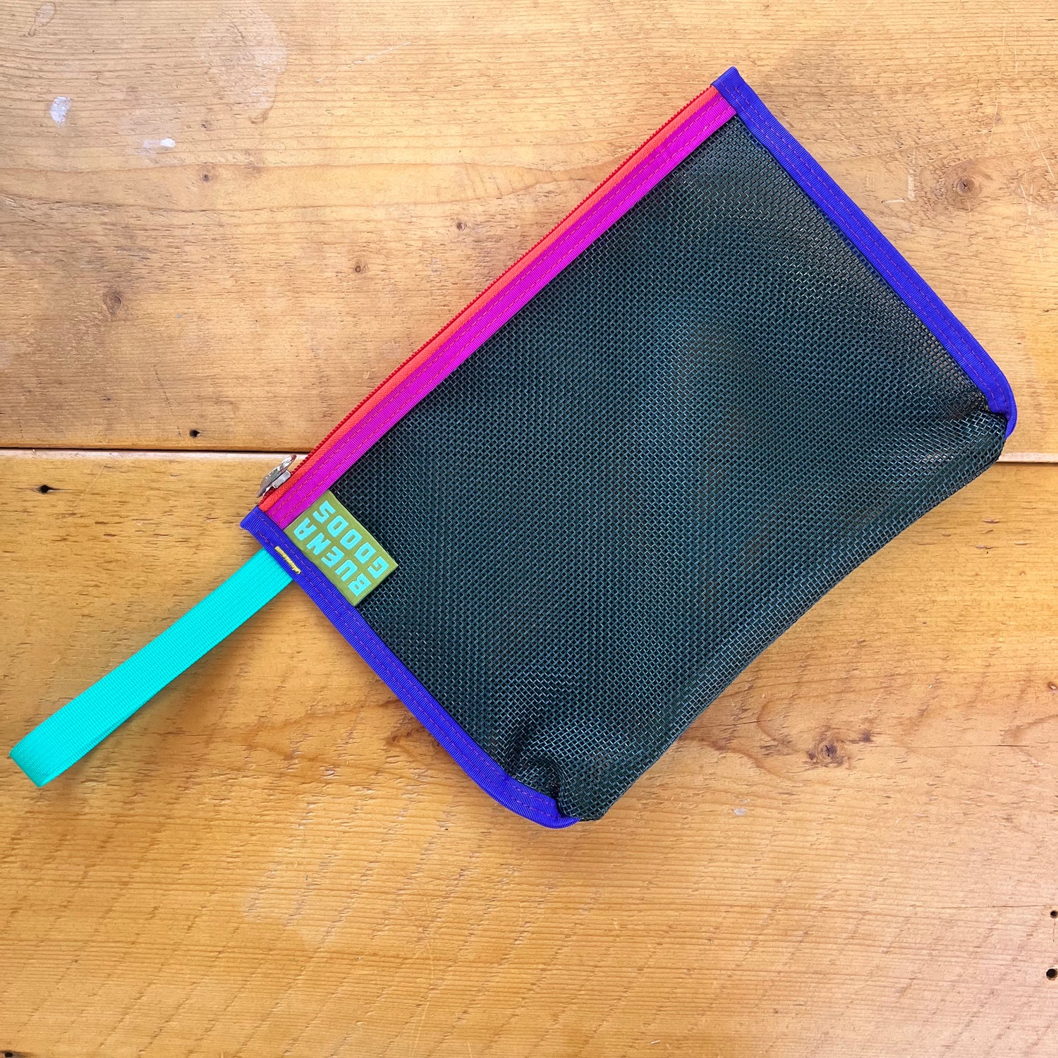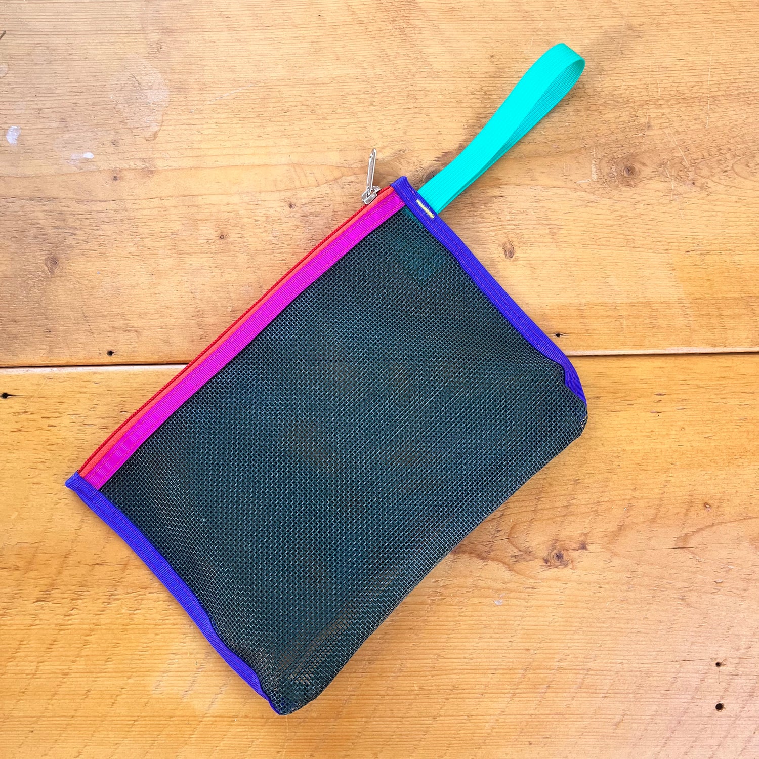 The L size of our pouches - this one is perfect for nesting and organizing - charging cables, sunscreen, toiletries, it's a versatile pouch! Made with industrial mesh, this is a no fuss fabric that is transparent. We use the quality standard brand of YKK zippers on all of our products because durability is a pillar at Buena Goods. How can a good good be good without it?