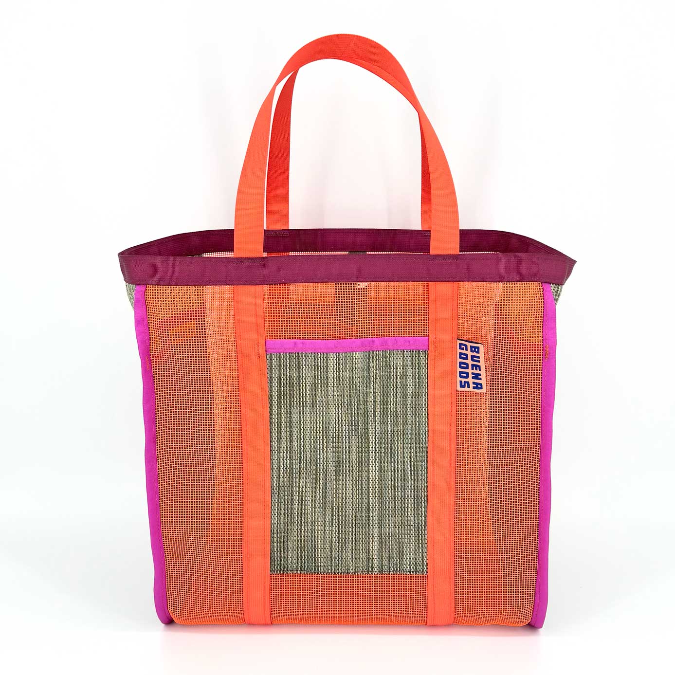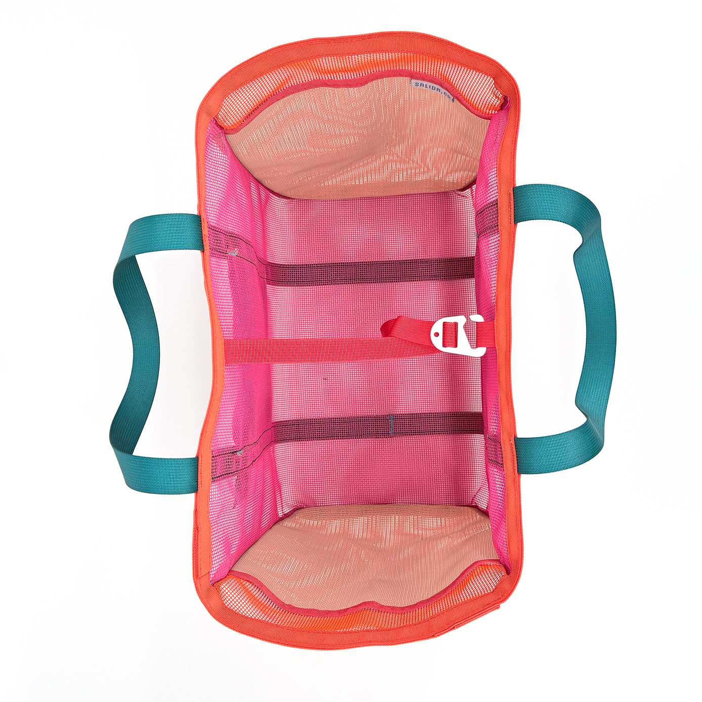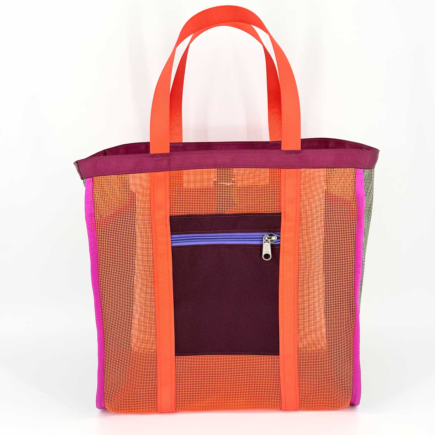 All of our products are made of industrial plastic mesh that holds up to sun, dirt, and heavy loads. The Mother is perfectly pocketed: two internal for organization, one with a zipper to keep your phone out of the sand, and two simple pockets for quick access. The adjustable strap on the top increases cargo possibilities —- just when you think the bag is full, you manage to strap on three more puffies.