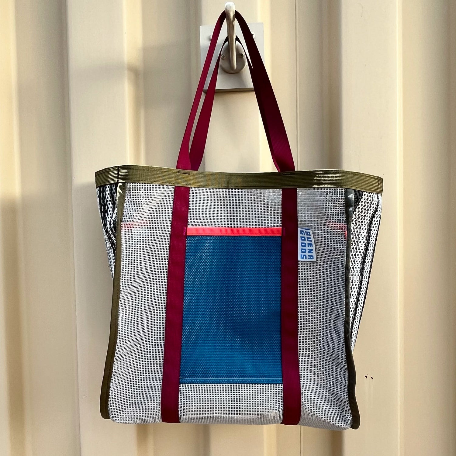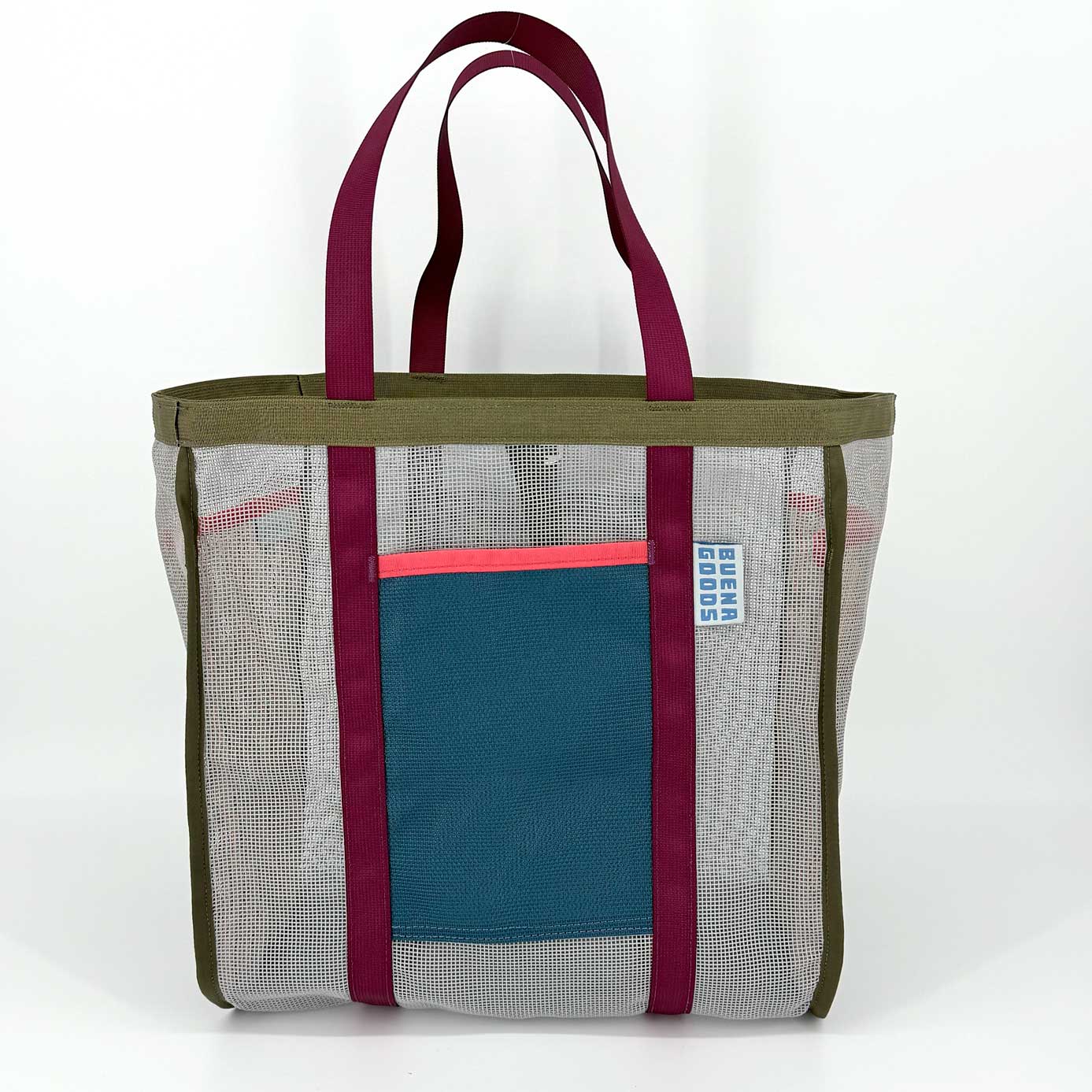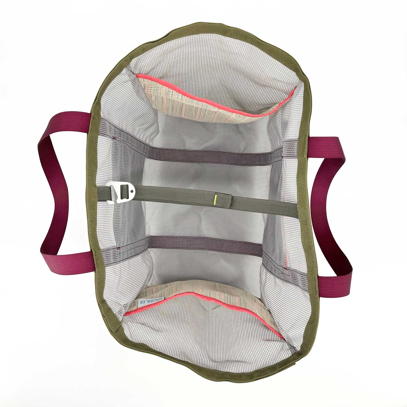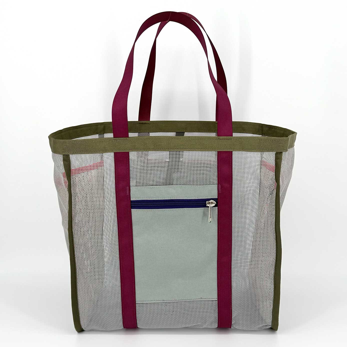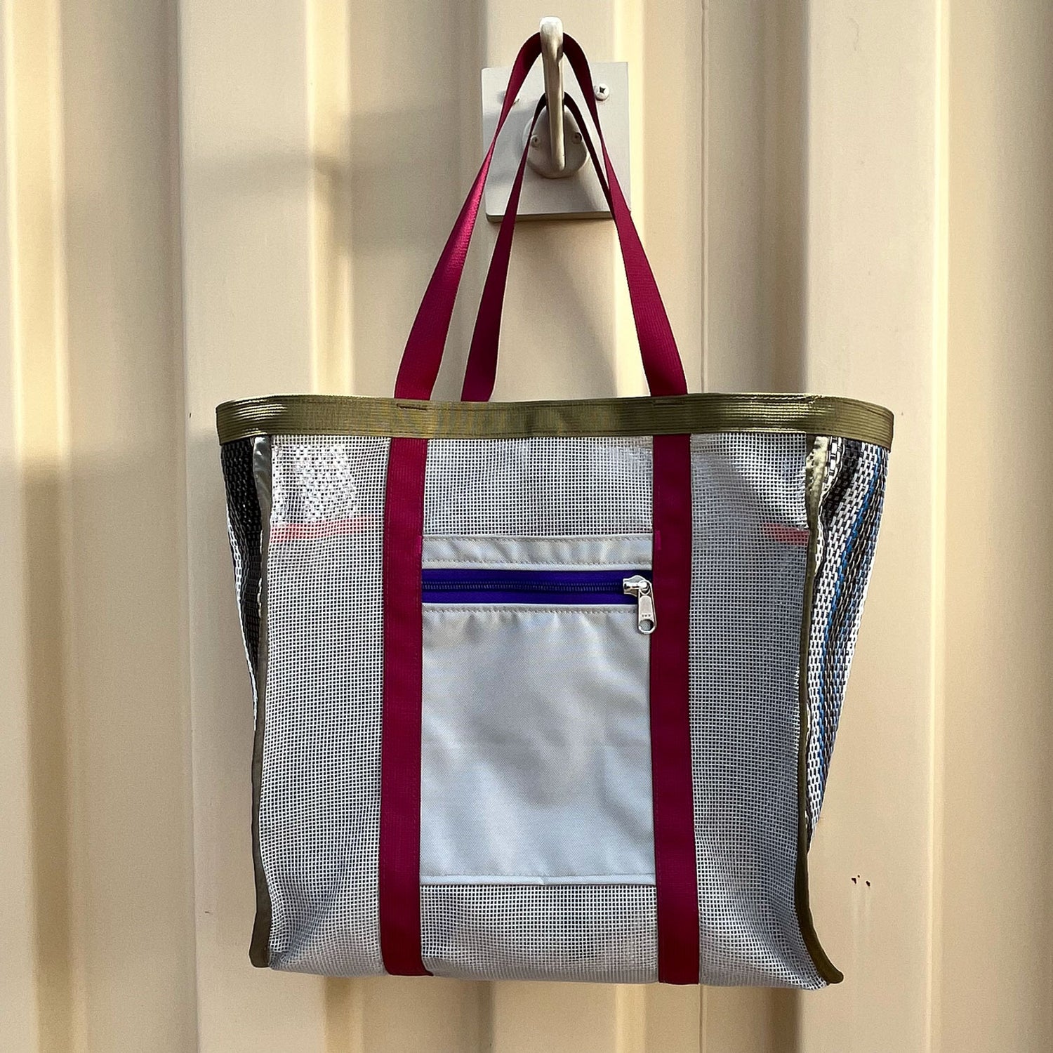 Made of industrial plastic mesh that holds up to sun, dirt, and heavy loads. Perfectly pocketed: two internal for organization, one with a zipper to keep your phone out of the sand, and two simple pockets for quick access. The adjustable strap on the top increases cargo possibilities —- just when you think the bag is full, you manage to strap on three more puffies.