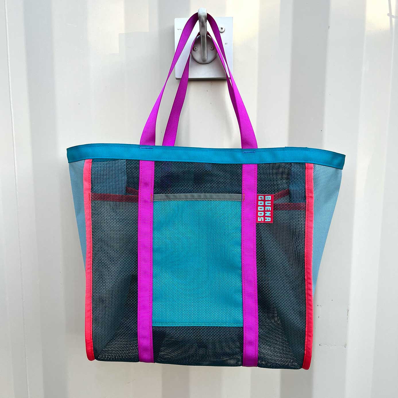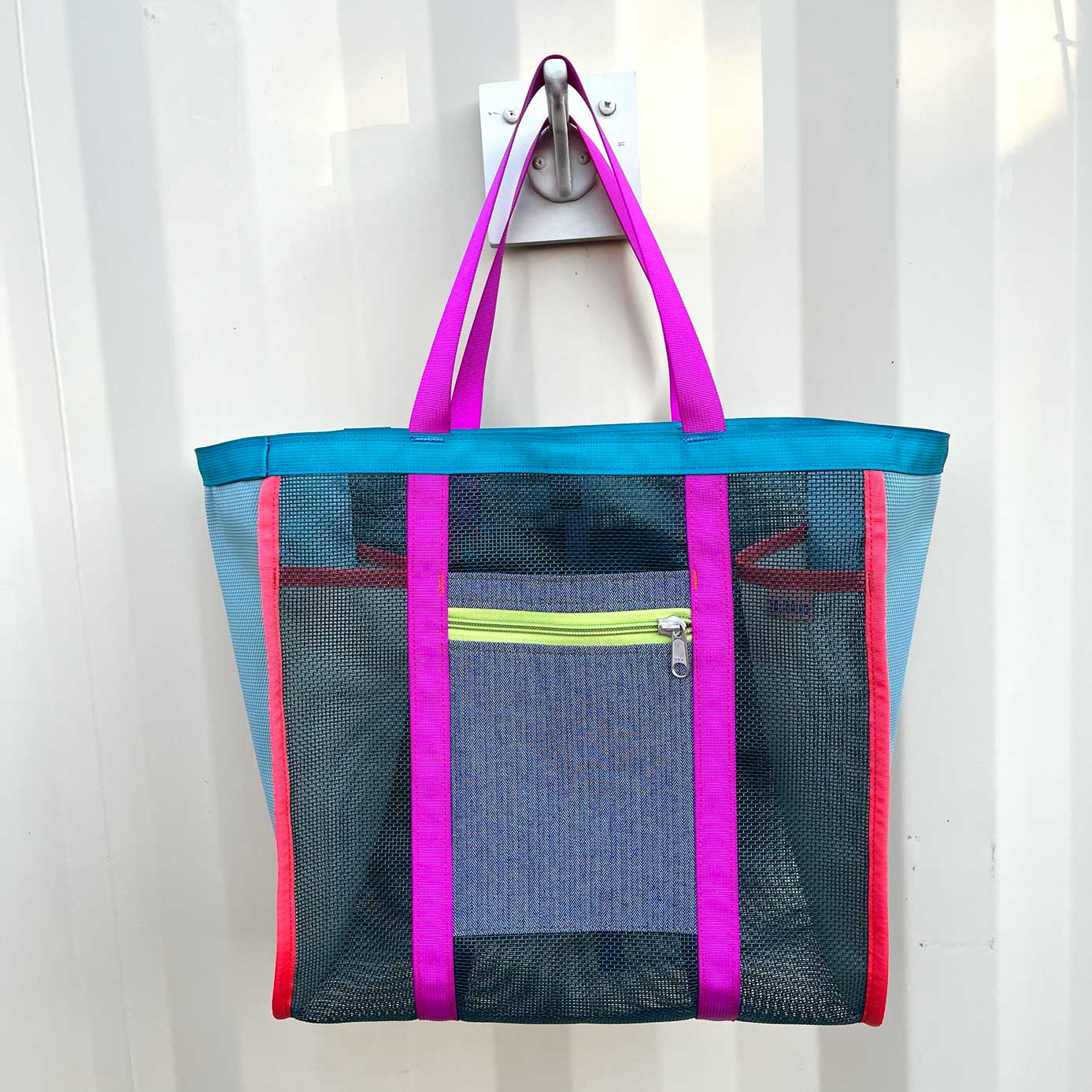 All of our products are made of industrial plastic mesh that holds up to sun, dirt, and heavy loads. The Mother is perfectly pocketed: two internal for organization, one with a zipper to keep your phone out of the sand, and two simple pockets for quick access. The adjustable strap on the top increases cargo possibilities —- just when you think the bag is full, you manage to strap on three more puffies.